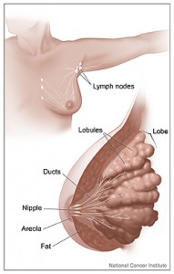 Within the breast are millions of milk producing sacs, called lobules. The milk is carried from the lobules to the nipple through ducts. There are lymphatics which carry normal body fluid called lymph from the breast to lymph nodes, many of which are located in the armpit region.